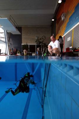 Dass die Gedankengänge nicht völlig falsch gewesen sind, zeigt die Tatsache, dass sich 15 Taucher aus neun Mitgliedsvereinen angemeldet hatten und am 29. Mai 2010 im Stadtbad Homburg zunächst einer theoretischen Einweisung lauschen durften, bevor es schließlich ins Becken und damit auf den „Hindernisparcours“ ging. Sieben verschiedene Szenarien, die den tauchenden Fotografen regelmäßig vor tariertechnische Probleme stellen, waren an der Wasseroberfläche, am Beckenboden oder an der Kachelwand mit Stoffbahnen, Röhren, Netzen und diversen Möbelstücken nachgestellt und boten die Gelegenheit, Tarier- und Schwimmtechniken zu trainieren.